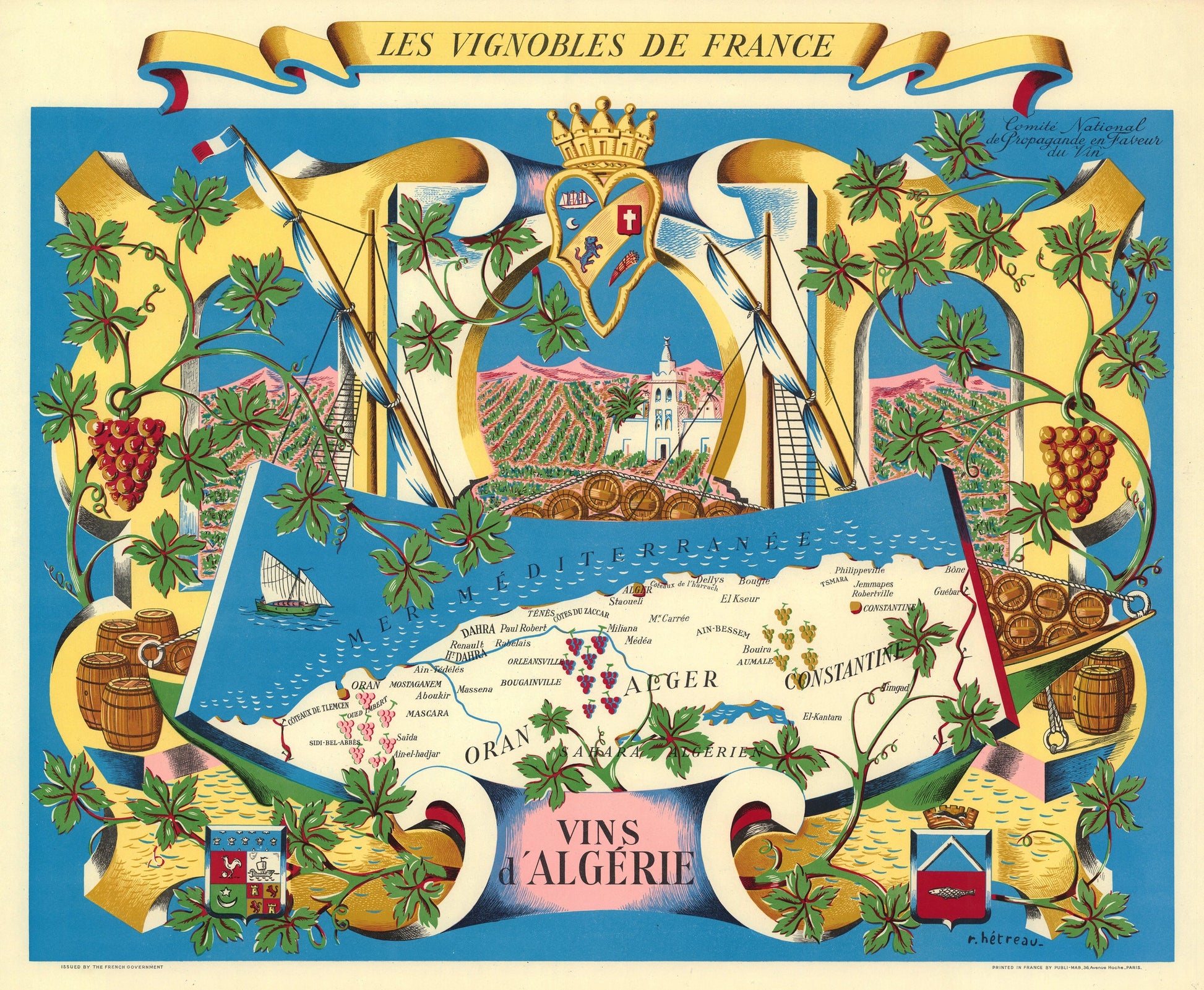 The title is contained in a ribbon cartouche at the top of the map.?A beautiful vineyard scene fills the top portion of the map presenting an Algerian chateaux topped with a crescent moon nestled among vineyards with mountains in the background. Aside from the grape vines and numerous crests, the map features crated barrels ready to be shipped across the Mediterranean to southern France. Two ship masts with furled sails and the French flag rise prominently above the map. A combination of pink, red and white grapes are depicted among vineyards that stretch from Oran to Constantine.