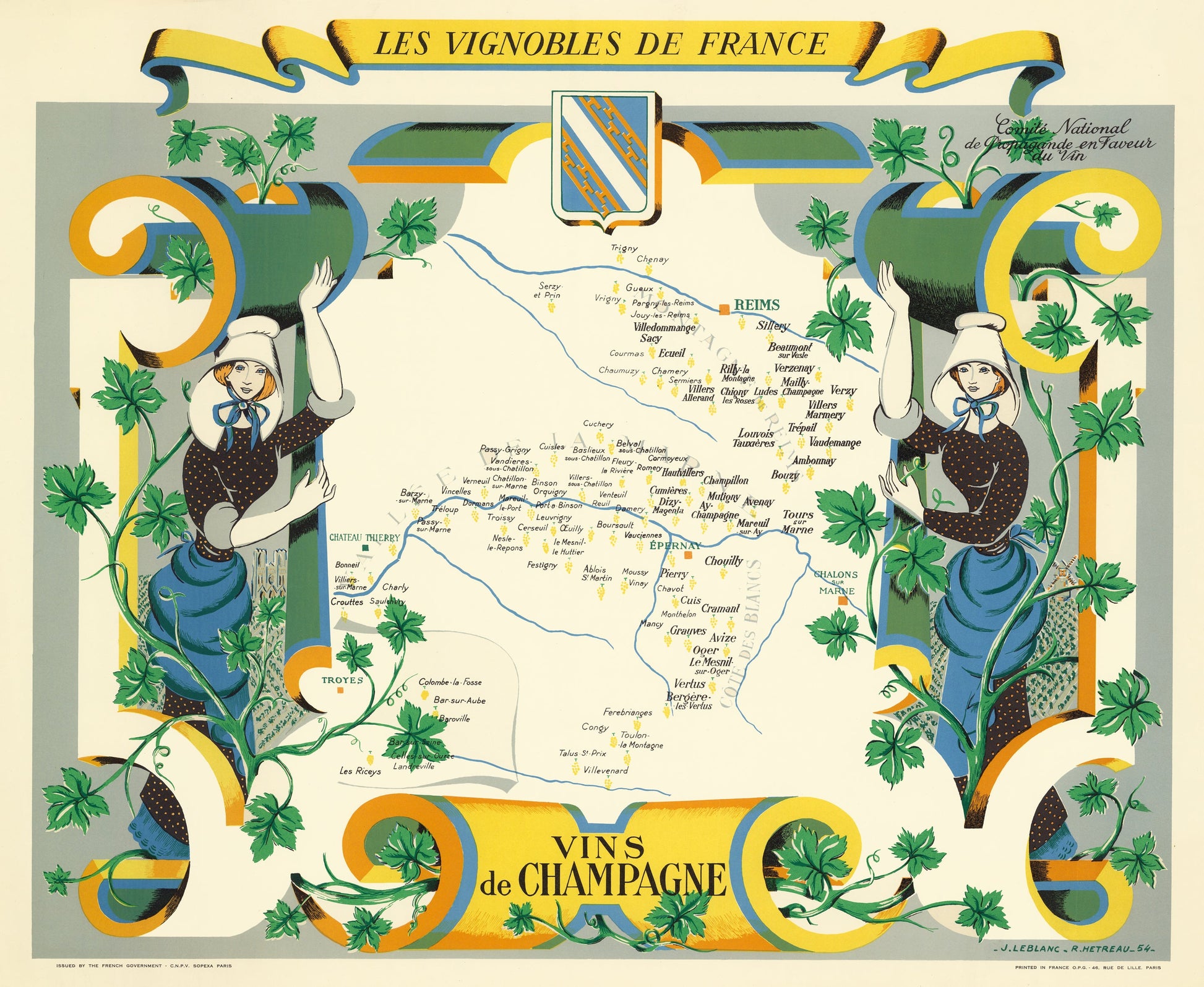 The title is contained in a ribbon cartouche at the top of the map.?Two maidens hold open a rolled map of the Champagne province of France, located in the northeast section of the country some 150 kilometers due east of Paris. Grape vines intertwine with baroque style scrollwork that surrounds the map on all sides. The map?identifies nearly one hundred vineyards located between and around the towns of Troyes, Epernay, Chalons Sur Marne, and Reims, all of which are marked with white grapes.