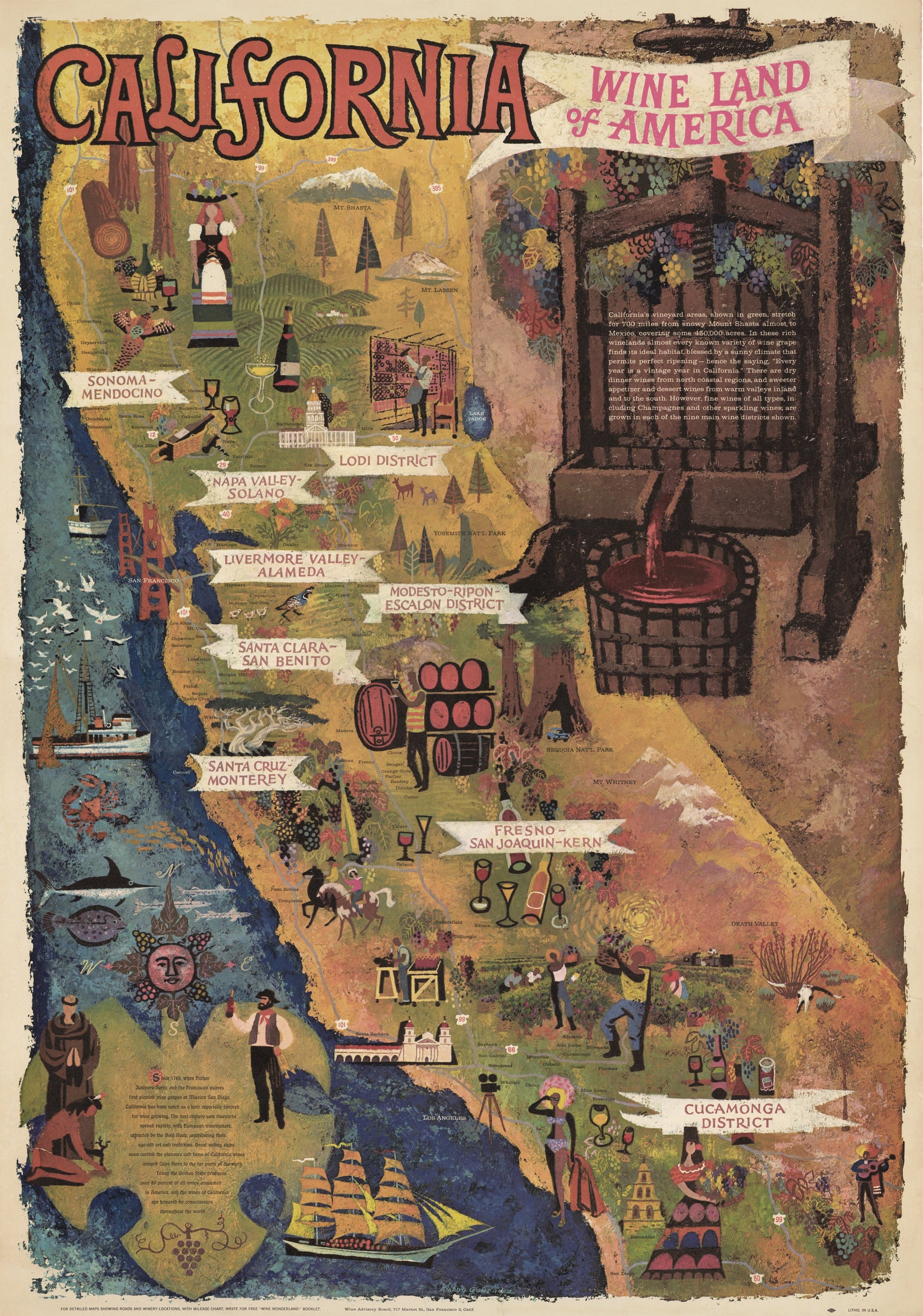 This is a fine print reproduction of a vibrant vintage poster that?presents much?California with a focus on the?wine regions. It was originally published by the ¡®Wine Advisory Board¡¯, to advertise the state¡¯s ever-increasing contribution to the wine-producing industry of the USA. The imagery of the poster conveys the multi-faceted aspects of the industry in the state, along with the many layers of culture which have contributed to its becoming a major wine-producing center.