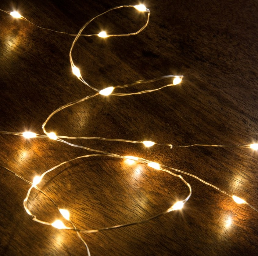 Micro wire string lights from our that are perfect to illuminate to any room. These wire string lights contain a 6-hour timer; takes 3 AA batteries (not included).