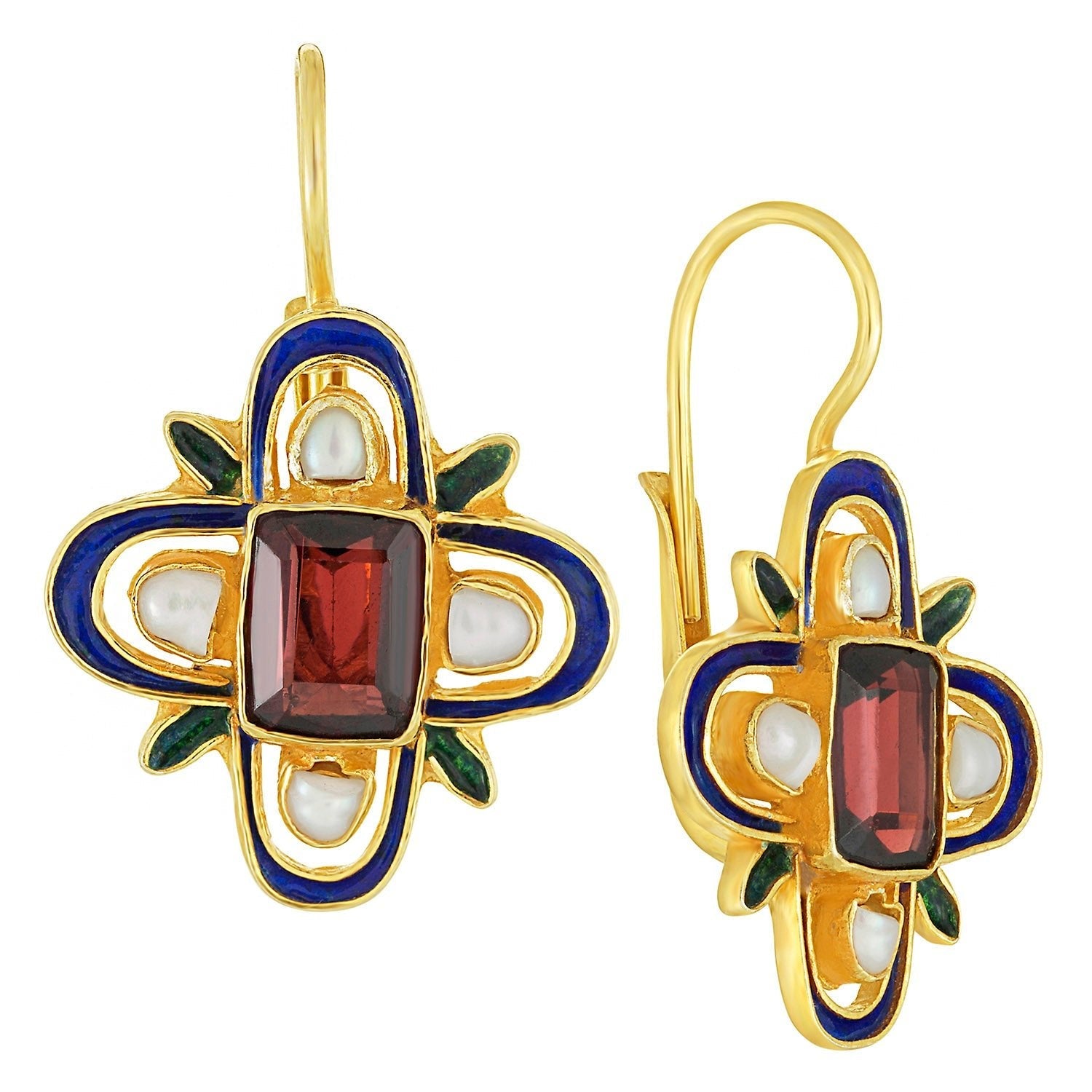 Imagination is alive in Renaissance designs like this one of garnets and cultured pearls, in a fanciful enameled setting. 24k gold over sterling silver. European backs. Size: 1 1/8 inches.