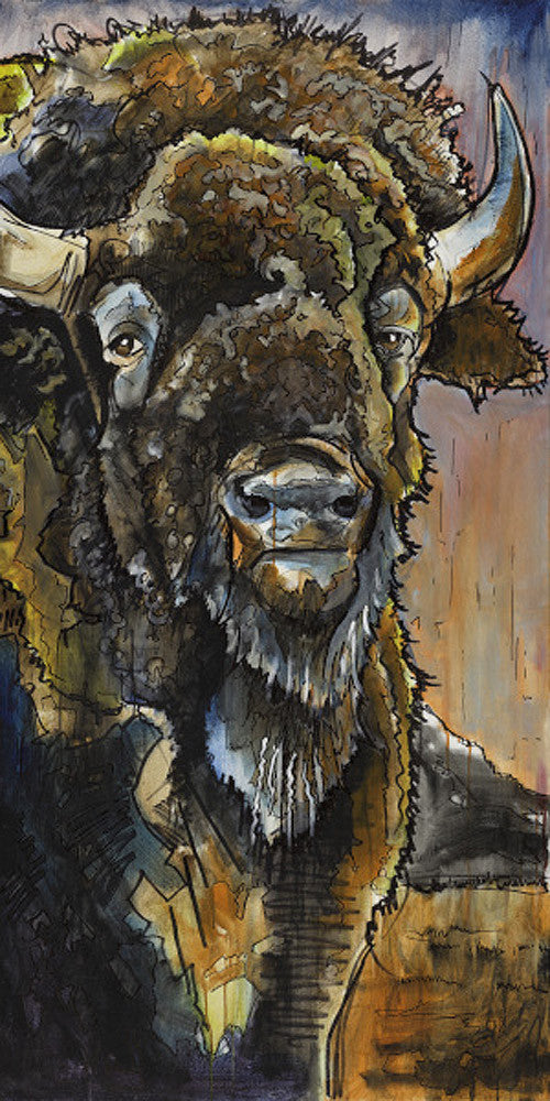 Almost Morning shows a sleepy abstract American Bison portrait. All the colors of the rainbow and probably a reflection of the morning sunrise on him.