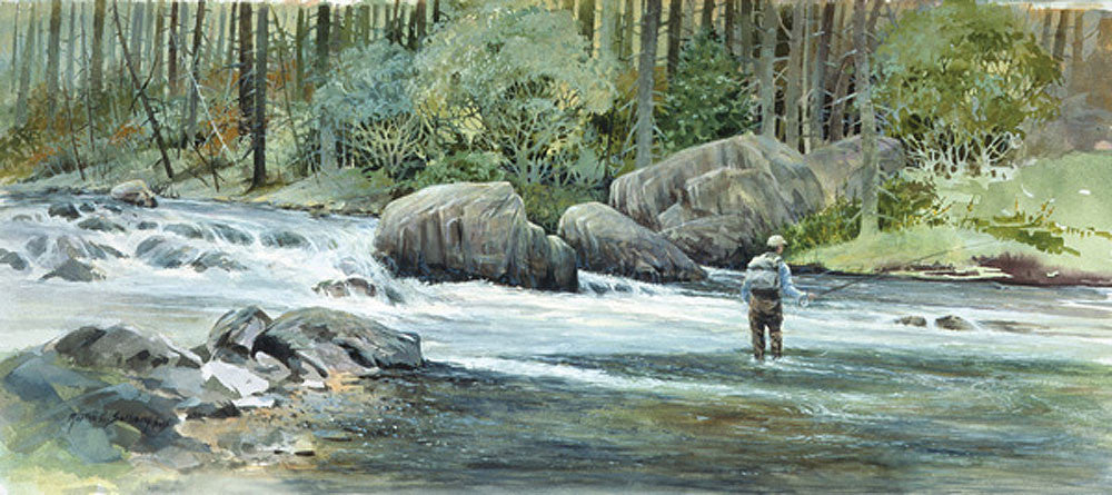A fisherman in the middle of the river just getting ready to cast his line into the rushing water above him. He's hoping to catch a big one and this is probably his favorite fishing hole. As well as fishing, you can almost hear the rushing water and enjoy all the quiet sounds of the forest ahead of him.
