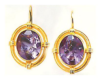 Design with deep rooted Victorian traditions. A hand cut amethyst glitters provocatively from its simple openwork gold vermeil (24k gold over sterling silver) frame. European backs for pierced ears. Size 1 1/4 inch.