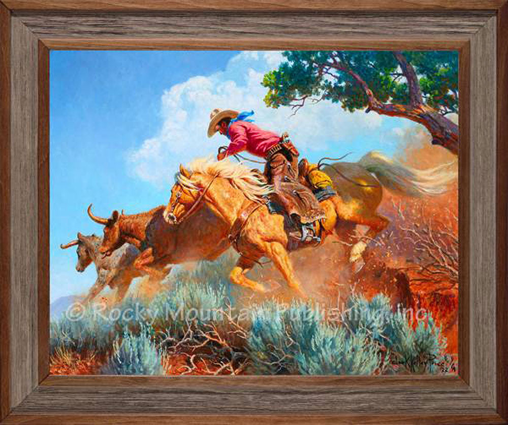 A cowboy on horse back is rapidly chasing two escaped long horn cattle that have taken off to who knows where.? All in a days work for a round up.? Gorgeous colors and blue sky highlight this piece of artwork!