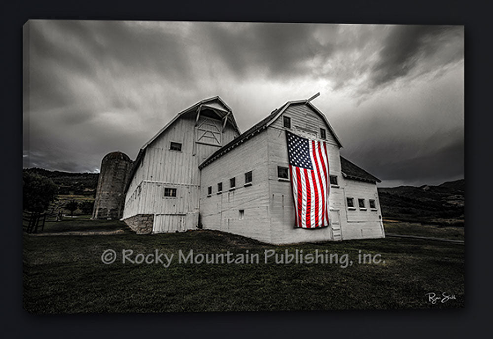 A huge white barn in the center of American farming country with an even bigger American Flag hanging in the front of the barn.? This almost black and white image definitely is highlighted by the red, white and blue!??
