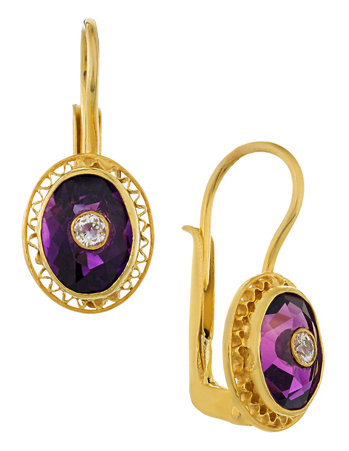 This elegant Victorian design could be found in countless parlors, where eating, drinking and clever conversation formed the heart of the Victorian home. Faceted amethyst inset with a small cubic zirconia in open-work setting of 24k gold over sterling silver. European lever-backs for pierced ears. Size: 1 1/8 inches.