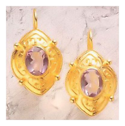 A romantic spirit was common to the early 19th century as these amethyst earrings testify. Set in vermeil shields (24k gold over sterling silver) decorated with filigree and granulation. European backs for pierced ears. Size: 1 1/4 Inch.