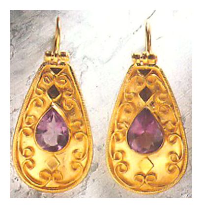 A renaissance period design like this is a warm living thing. It has to be loved and respected. Diamond-cut amethyst are bezel-mounted in a unique vermeil setting. 24k gold over sterling silver, embellished with filigree scroll work. Hoop backs for pierced ears. Size: 1 5/8 inches.