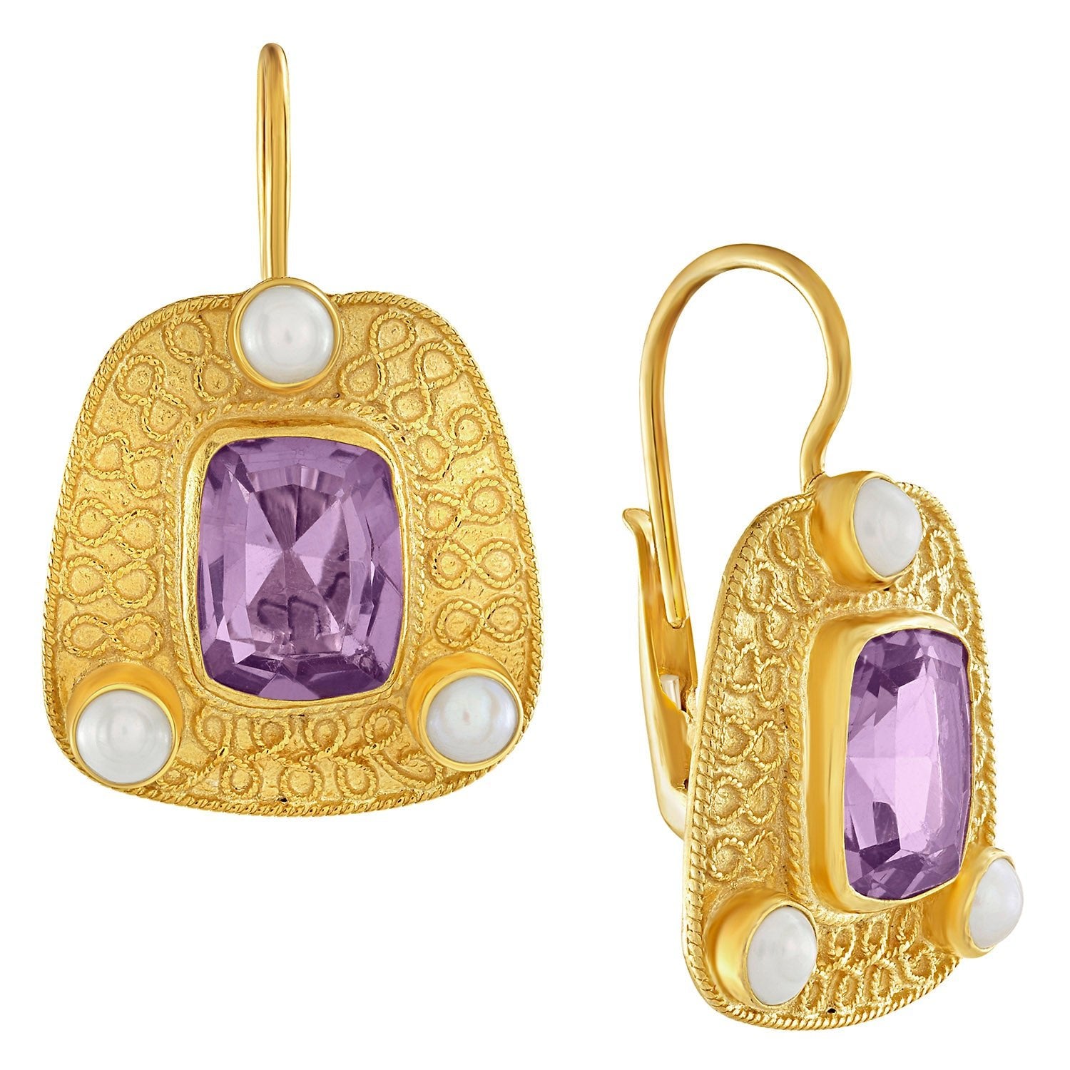 Virtually a masterpiece of hand craftsmanship. Very few modern master craftsmen can do such a work. This Celtic creation highlights an Amethyst stone sometimes called Rose de France accented by three cultured pearls. Filigreed medallion setting of 24k gold over sterling silver. European backs for pierced ears. Size: 1 1/8 inches.