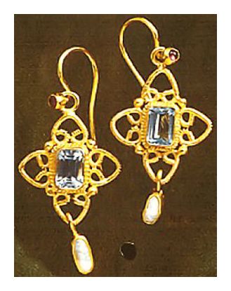 Belles of the ballroom once wore this fanciful Victorian design. 24k gold over sterling silver settings. Garnet-accented hoop backs. Size 1 5/8 inches.